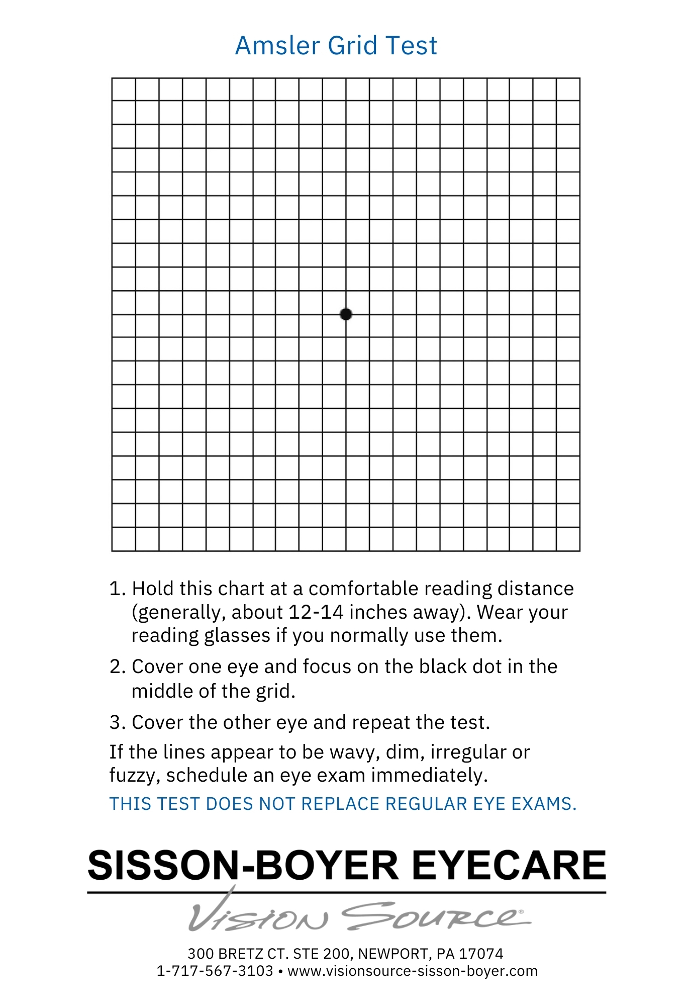 The Amsler Grid Test is a simple tool used to monitor your central vision and detect potential changes that may indicate conditions such as macular degeneration.